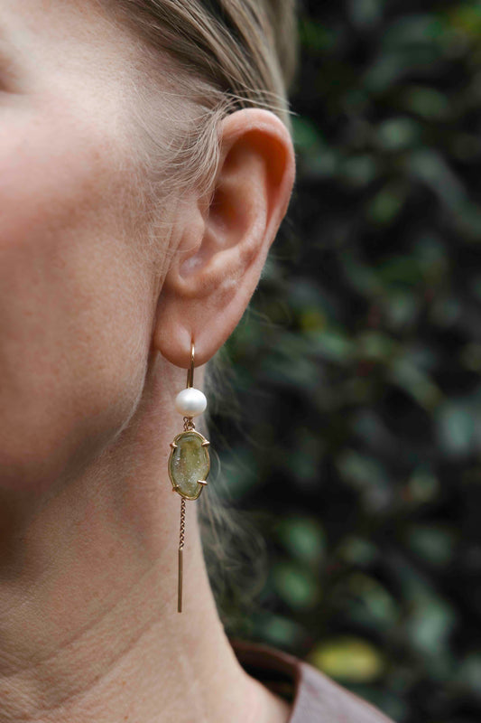 Karolin Van Loon earrings enliven traditional styles like hoops, studs and drop pendants with the addition of precious agate geodes.
