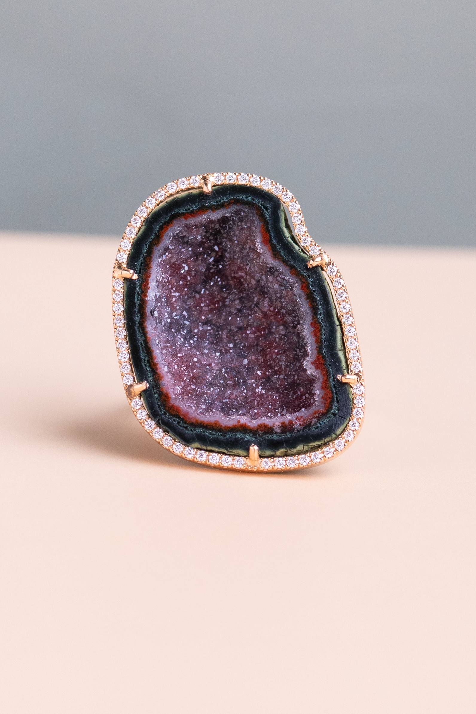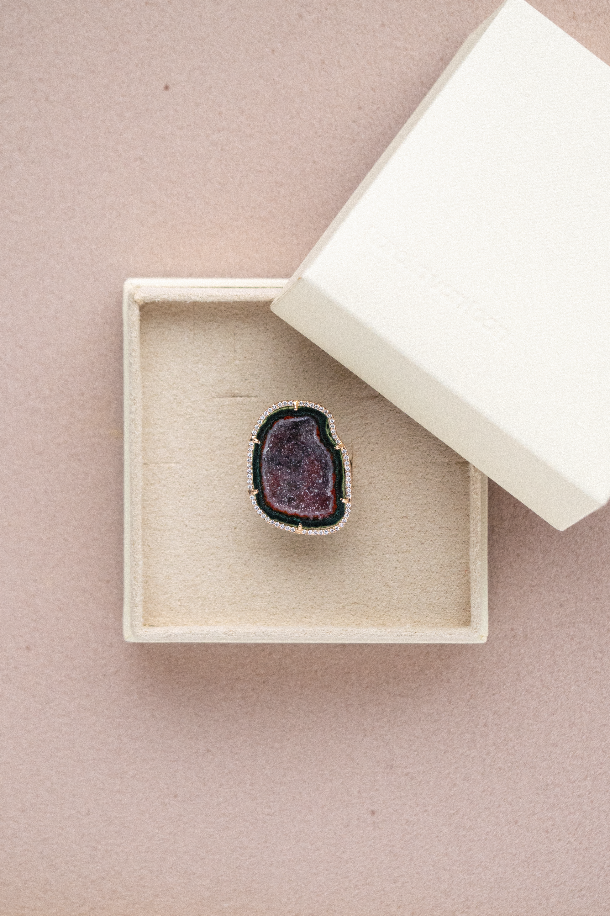 Karolin Van Loon High Jewellery is made from agate geodes, stones that have a simple exterior but open to reveal colourful, crystalline formations at their core. These precious stones are formed through volcanic reactions, sedimentation, and weathering processes over thousands of years before they are brought to Karolin Van Loon’s Antwerp atelier and transformed into singular pieces of fine jewellery.