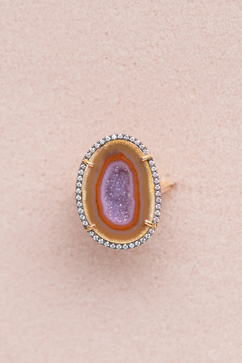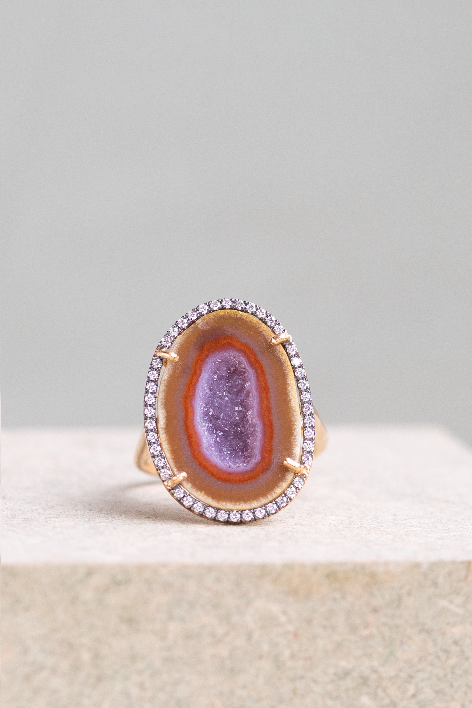 Agates encircled by a halo of diamonds, elegantly realised as a one of a kind ring.