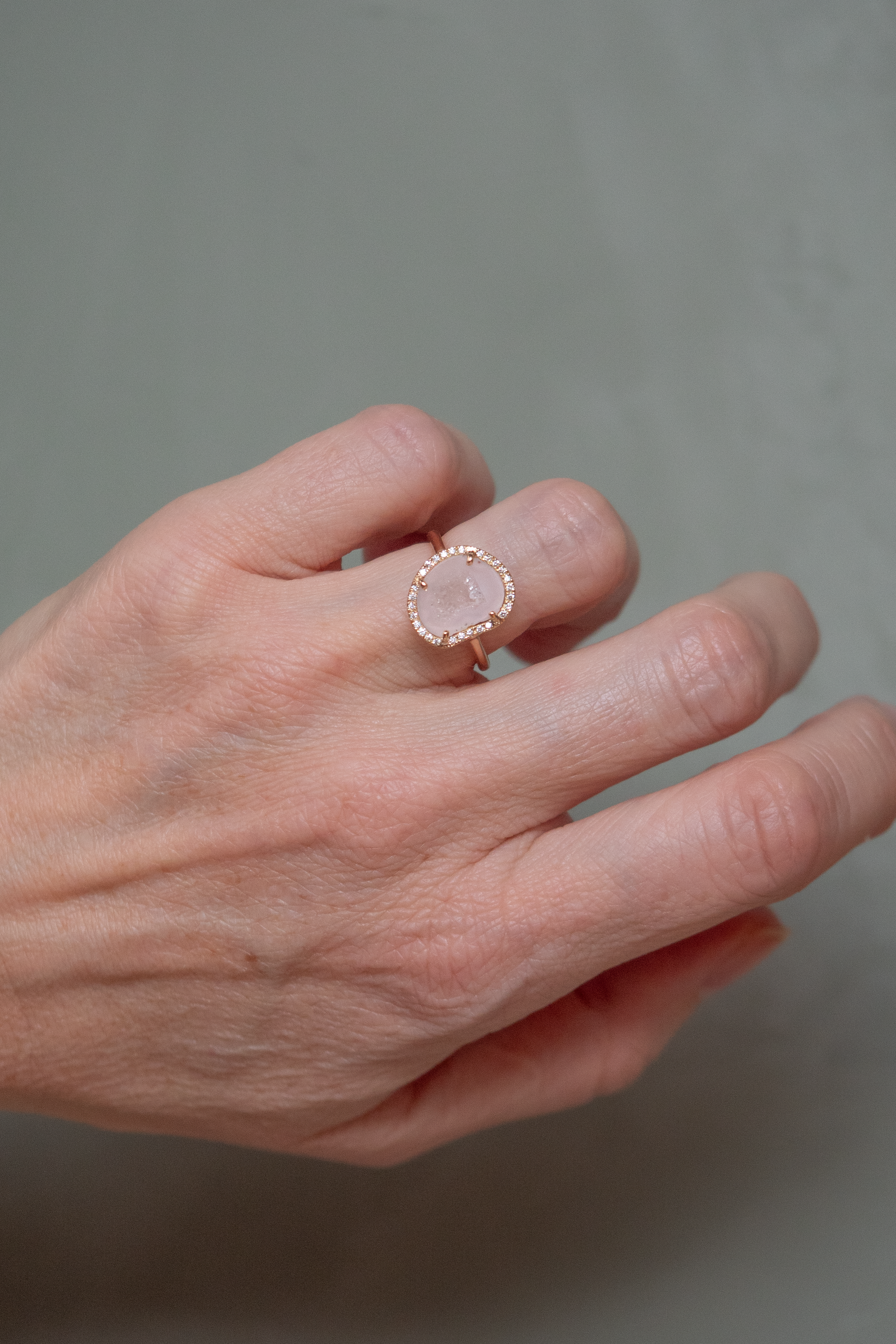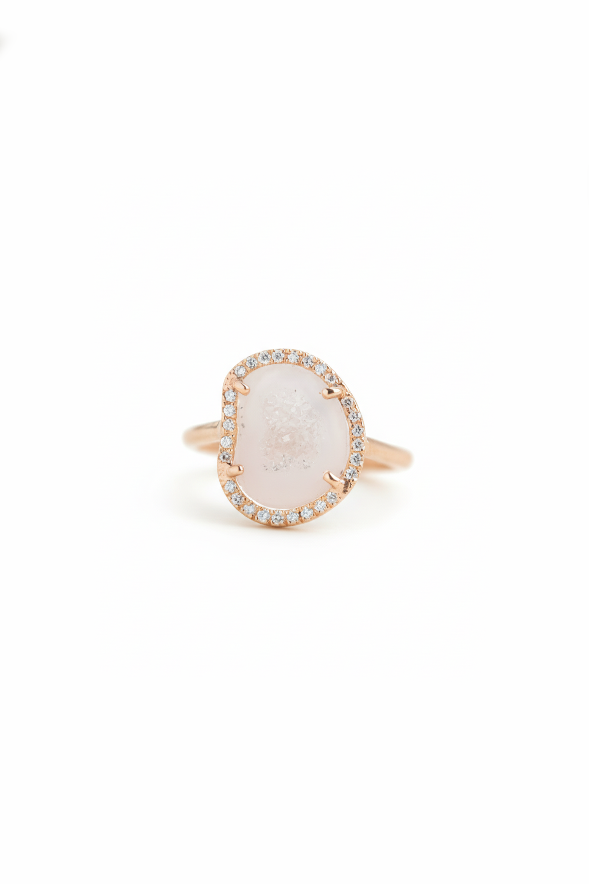Crafted in 18K rose gold and set with 0.18 carat brilliant-cut diamonds, this one-of-a-kind ring frames a single luminous agate with a delicate diamond halo.