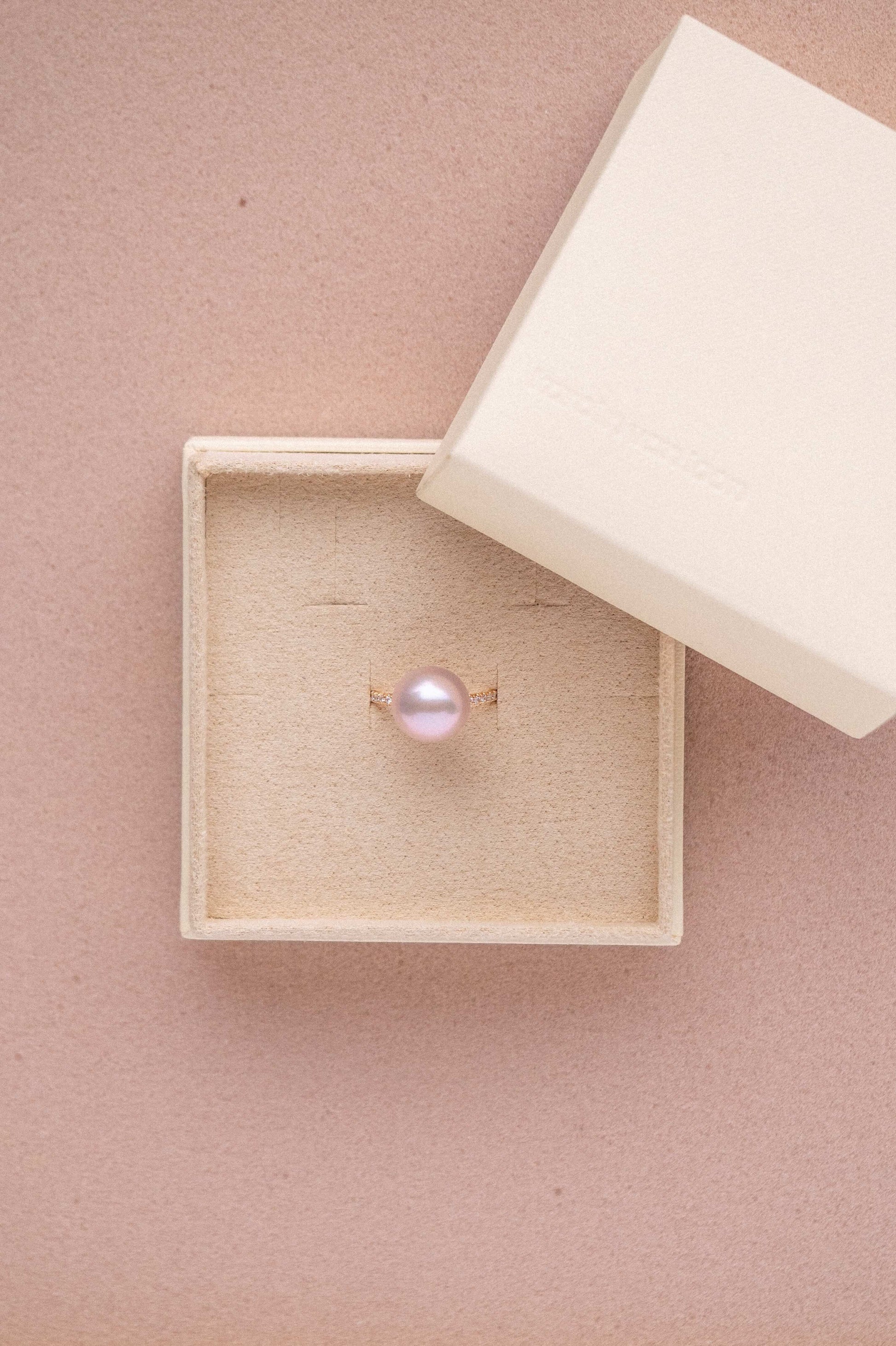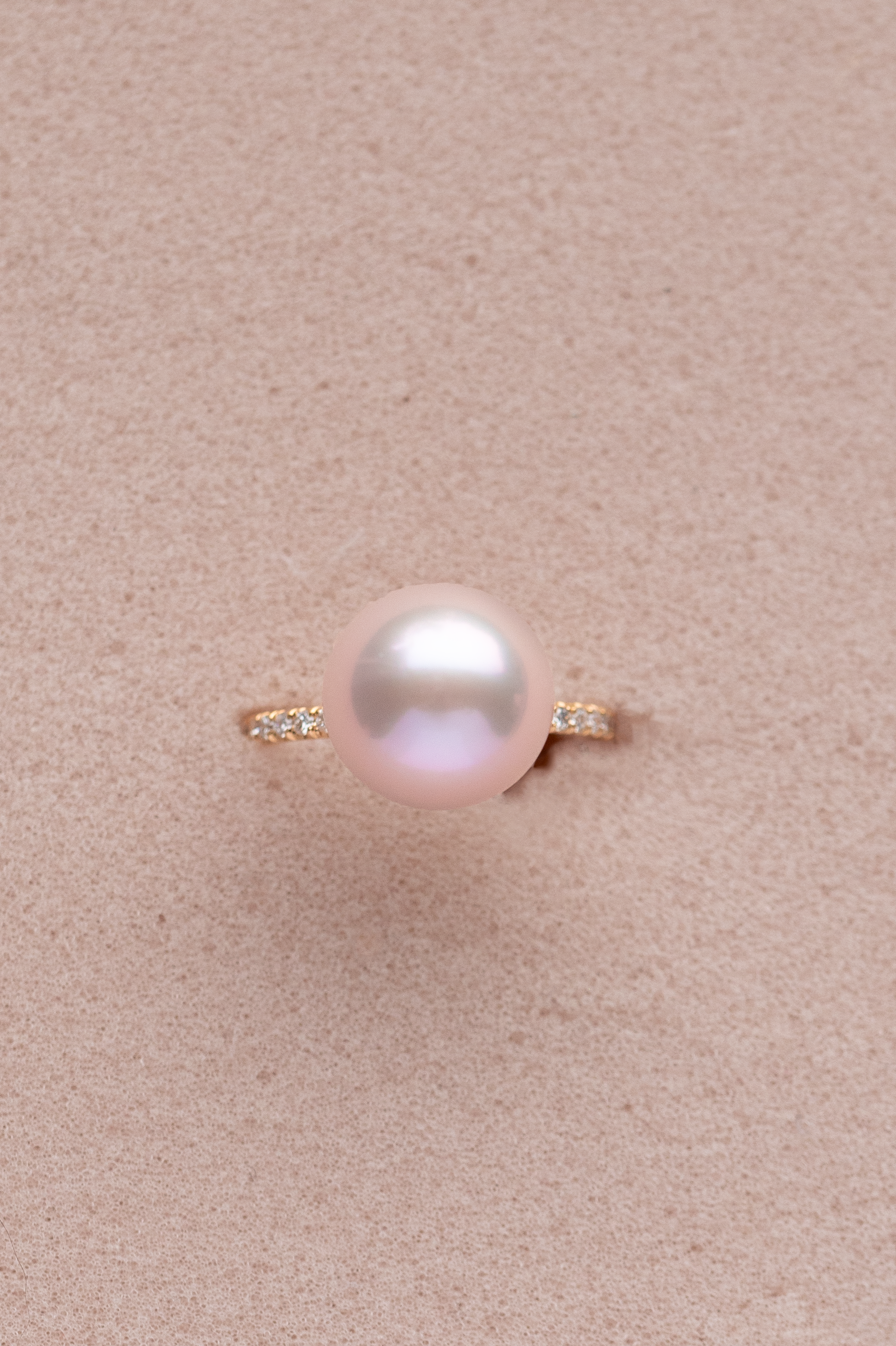 A spherical pearl sits on a ring of diamonds and rose gold.
